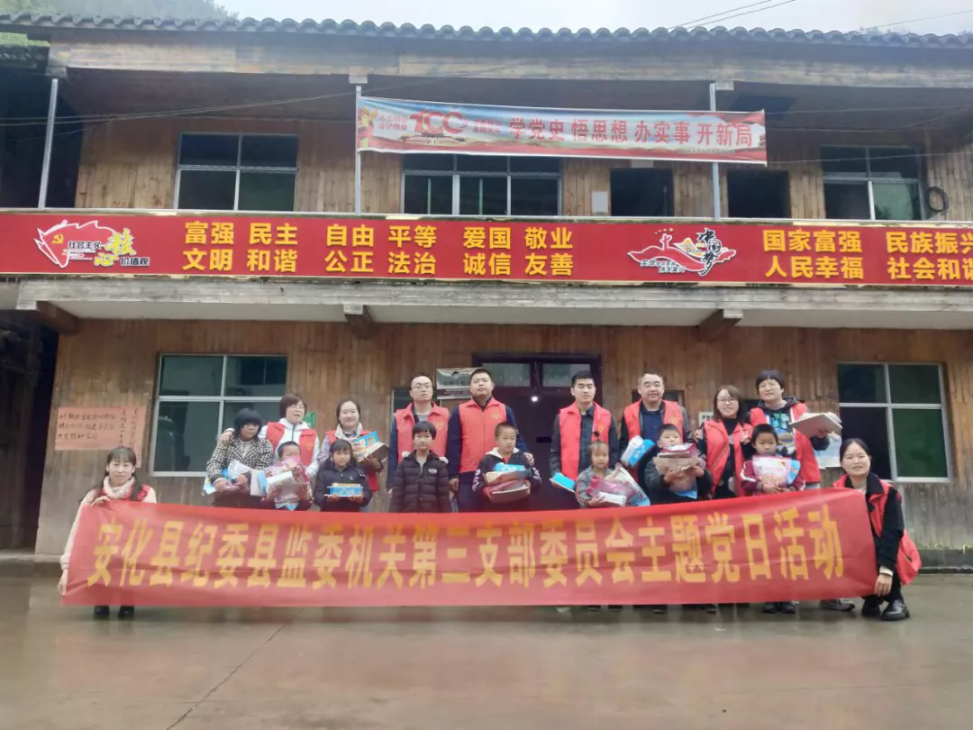 天子山小学地处偏远,位于田庄乡天子山村,海拔约600米,山路蜿蜒,交通不便,学校仅有1名代课老师和8名学生,是县纪委监委志愿者帮扶的联系点。11月4日,县纪委监委机关第三支部党员干部踏着薄雾、揣着温暖,驱车近2小时前往天子山小学开展志愿者活动。