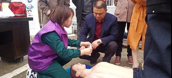 村干部张爱华与现场工作人员学习心肺复苏、人工呼吸等急救方法