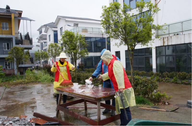近日,在茶乡花海易地扶贫搬迁集中安置区,梅山城投集团公司的党员志愿者从“小区泥沙枯叶堆积”“乱扔生活垃圾”等群众反应强烈的问题着手,冒着风雨积极参与到社区人居环境整治活动中。