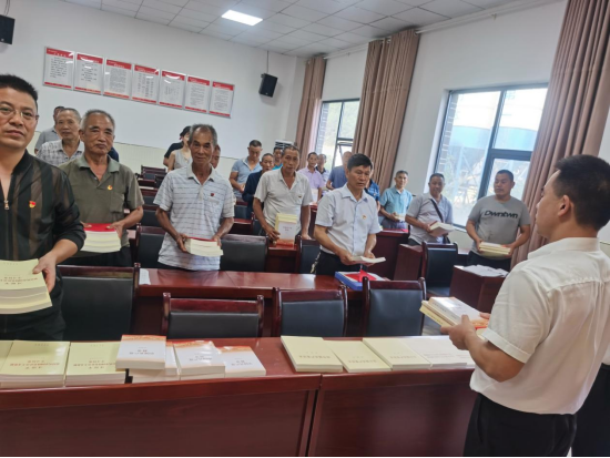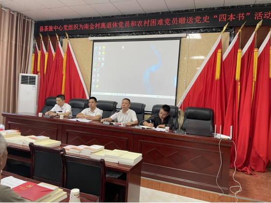 在南金乡南金村党总支部会议室,县茶旅中心驻南金村帮扶工作队代表中心党组织将《中国共产党简史》《论中国共产党历史》等党史学习书籍送到该村离退休和特殊困难党员30名代表的手里。