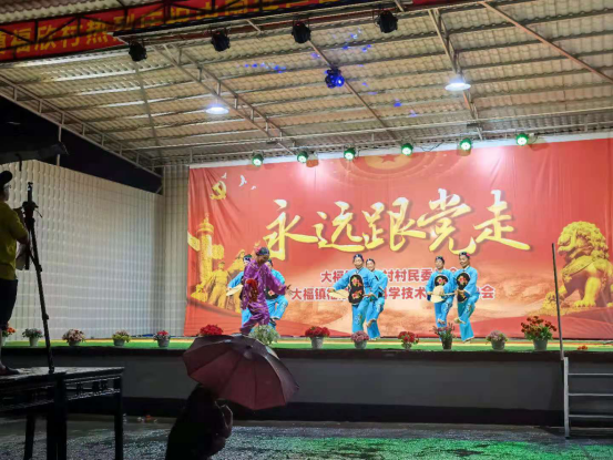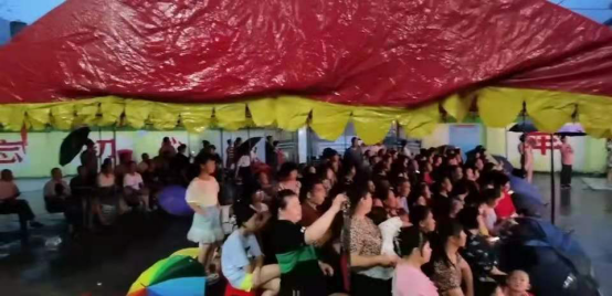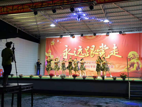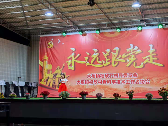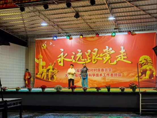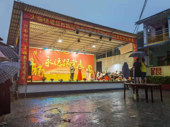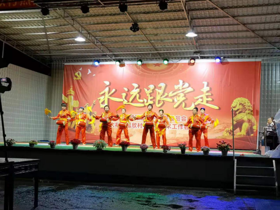 党群同心谋发展 齐心共力畅未来 6月30日晚7时,大雨倾盆,但依然阻挡不了福欣村全体居民想要为党庆生的热情,福欣村“庆祝建党100周年——永远跟党走”文艺晚会在群众的欢呼声中准时开幕。