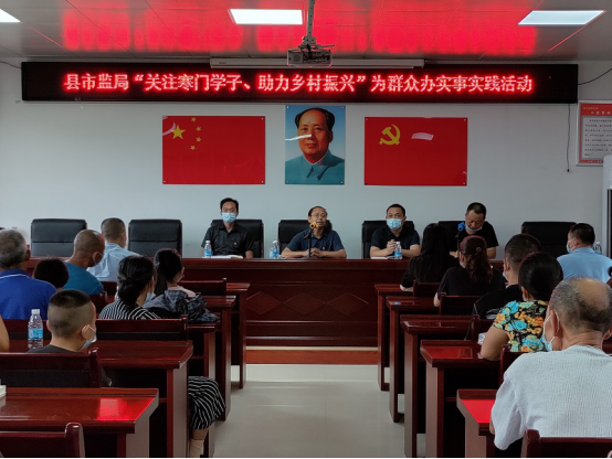 8月24日,县市监局党组书记,局长刘卫方带队到我局乡村振兴点羊角塘镇董木溪村开展“关注寒门学子,助力乡村振兴”为群众办实事活动。 活动中,我局为董木溪村党员赠送了10套党史学习教育书籍,为该村80余名小学生每人赠送一套学习用品和读本,并为两名贫困家庭大学生送上了助学金。 县市监局党组成员,副局长阙建梦以“领会中央精神,助力乡村振兴“为题为到会党员干部和群众讲了一堂党课。他首先强调学习的重要性,勉励各位学生多读有用的书,成长成才。就如何搞好乡村振兴工作,他强调了三个方面:一是做好思想准备,充分认识国家乡村振兴战略的意义;二是做好能力准备,要有英明决策,果敢决断和坚定的执行力;三是找准目标精准施策,着力产业振兴,资源振兴,文化振兴,环境振兴和组织振兴。他要求党员干部要坚持人民情怀,一心为公,在工作中着眼于群众需求,争当先锋模范。 县市监局党组书记,局长刘卫方最后讲话,他强调,本次赠书助学活动立足于贴近群众,立足于践行为民办服务实事,旨在倡导关爱贫困家庭学生正能量,培养他们形成正确价值观,懂得感恩,勤奋学习,回报社会。